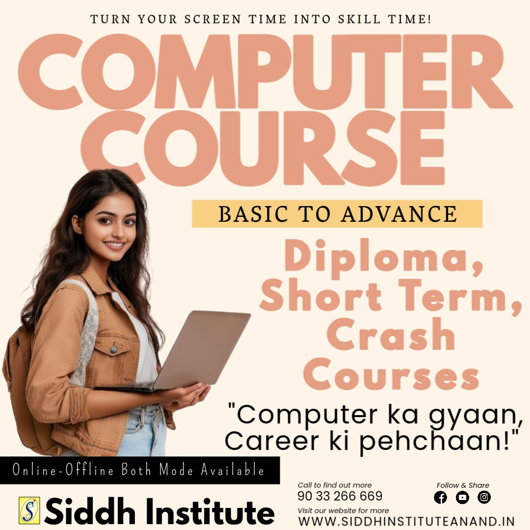 π» Computer Course β Basic to Advanced (Diploma | Short-Term | Crash Course) ________________________________________ π₯οΈ Description: π Turn your screen time into skill time! Start your digital journey with our Computer Course designed for beginners to advanced learners. Whether youβre a student, job-seeker, or professionalβthis course is your gateway to mastering computers from scratch to pro-level. π― What Youβll Learn: β’ β Computer Fundamentals & Typing Skills β’ β Microsoft Office (Word, Excel, PowerPoint) β’ β Internet, Email & Cloud Tools β’ β Digital File Management & Data Entry β’ β Operating Systems: Windows & Basic Troubleshooting β’ β Basic Design & Presentation Tools β’ β Tally ERP 9 & GST (Add-on Option) β’ β Introduction to Programming (Optional) β’ β Cyber Safety & Online Etiquette π Diploma, Short-Term, and Crash Course Options Available π« National & International Certificate by NIED π§π« Master Faculty + Personal Coaching πΌ 100% Placement Assistance π Free Bag, Book & Study Materials π Online + Offline Mode Available ________________________________________ π Siddh Institute (Since 2003) 2nd Floor, Laksh 511 π’ Beside Sanket India ποΈ, Opp. Dev Shree Gold π Rajpath Marg, Anand - 388001 π π 90332 66669 | 72290 95002 π Bonus Free Course Worth βΉ20, 000/- π¬ 'Computer ka Gyaan, Career ki Pehchaan!' ________________________________________ β’ Computer Course in Anand β’ Basic to Advanced Computer Classes β’ Best Computer Institute Gujarat β’ Diploma in Computer Application β’ Microsoft Office Training Anand β’ Computer Typing & Fundamentals Course β’ Job Oriented Computer Courses β’ Crash Course in Computers Anand β’ NIED Certified Computer Course β’ Siddh Institute Computer Training β’ Short Term Computer Course with Certificate β’ Online & Offline Computer Classes Gujarat β’ Free Computer Course with Certification β’ Computer Course for Job Seekers β’ Personal Coaching in Computers Anand ________________________________________