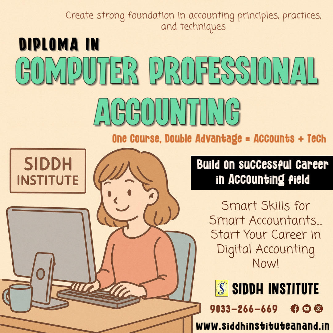 Create strong foundation in accounting principles, practices, and techniques DIPLOMA IN COMPUTER PROFESSIONAL ACCOUNTING One course, double advantage= accounts + tech Build on successful career in Accounting field Smart skills for smart accountants... Start your career in digital accounting now! Unlock the power of digital finance with our Diploma in Computer Professional Accounting! This course offers a perfect blend of core accounting principles and modern computer skills—giving you a double advantage in the job market. Learn to manage accounts digitally using popular software tools, understand real-world business practices, and gain hands-on experience in GST, Tally, Excel, and other essential platforms. Whether you're a beginner or upgrading your skills, this diploma lays a strong foundation for a successful career in the finance and accounting field. Start your journey toward becoming a Smart Accountant for the Digital Age! ________________________________________ • Computer accounting course • Diploma in accounting and computer • Tally and GST course • Professional accounting diploma • Digital accounting course • Accounting with computer skills • Job-oriented accounting course • Learn Tally ERP 9 • Accounting course with certification • Best accounting course in Gujarat • Accounting course with placement • Accounting career course