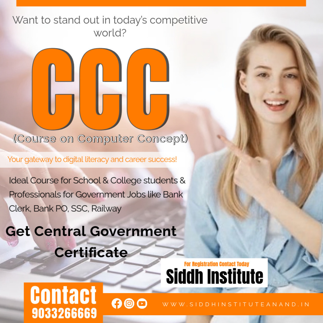 Upgrade Your Digital Skills with the Most Trusted CCC Course in Anand! Join Siddh Institute (Since 2003) and get certified with a Central Government Approved CCC Certificate. 👩🏫 Personal Coaching by Master Faculty 💼 Perfect for Government Job Aspirants, College Students, and Working Professionals 🎓 100% Practical Training + Study Materials Free 📚 Includes Computer Fundamentals, Internet, Email, MS Office, Excel, and More 🖥️ Online + Offline Mode Available 🎁 Special Offer: Get Free Bonus Course Worth ₹20, 000 + Study Bag & Book 📜 Certificate by NIED (National Council) – Recognized Nationally & Internationally 🔹 Address: Siddh Institute (Since 2003), 2nd Floor, Laksh 511 🏢, Beside Sanket India 🛍️, Opp. Dev Shree Gold 💎, Rajpath Marg, Anand - 388001 📍 📞 Contact: 90332 66669 | 72290 95002 🌟 Learn Smart. Learn CCC at Siddh. Your Career Starts Here! ________________________________________ • CCC Course in Anand • Central Government CCC Certificate Course • CCC Coaching Near Me • CCC Computer Class with Practical • CCC for Government Jobs • Best CCC Institute in Gujarat • Personal Coaching for CCC • CCC Course with Certificate in Anand • GMB CCC Computer Course Offer • CCC Computer Training Institute • NIED CCC Certificate Institute • CCC Admission Open Anand • Computer Course CCC Basic to Advance • CCC with MS Office and Internet • Job Oriented CCC Computer Course • CCC Course for College Students • Online CCC Training with Certificate • CCC Coaching Siddh Institute Anand