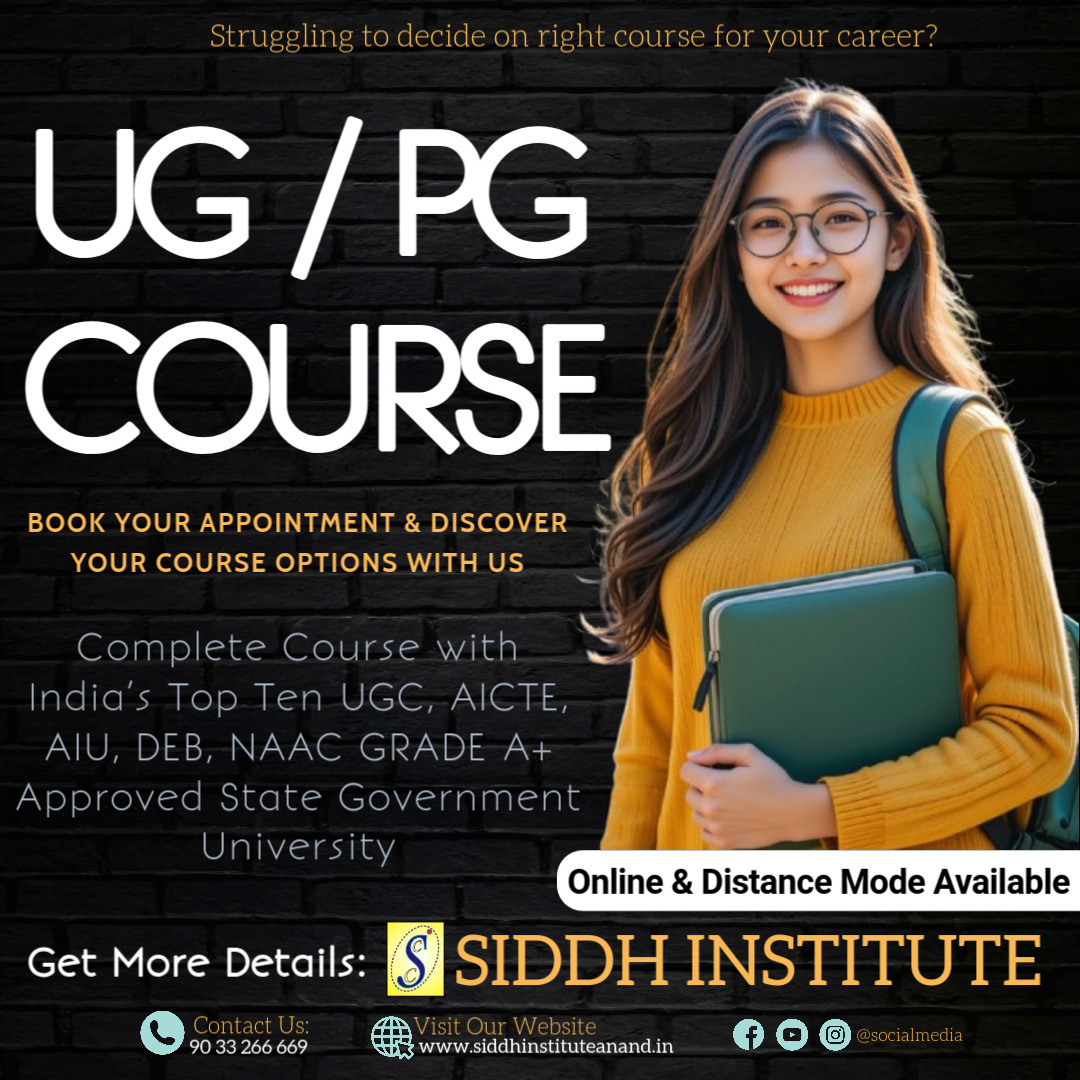 Struggling to decide the right course for your career? 🤔✨ At Siddh Institute, we guide you towards the best UG & PG Courses in all specializations through India’s Top 10 State Government Universities, approved by UGC, AICTE, AIU, DEB & NAAC Grade A+. ✅ Complete Online & Distance Learning Programs ✅ State & Central Government Recognized ✅ Personal Career Counseling & Guidance ✅ Flexible Learning with 100% Authentic Certification 👉 Whether you’re a 12th pass student, graduate, working professional, or career switcher, we help you choose the right course that shapes your future. Book your counseling appointment today and discover your best career options with us! ________________________________________ • UG Courses Admission 2024 Gujarat • PG Courses Distance & Online India • Government Approved Distance Learning • UGC AICTE Approved Universities in Gujarat • NAAC A+ Certified Universities Admission • State Government University Distance Programs • Best Distance Learning Institute in Anand • Top Distance & Online Degree Programs Gujarat • Career Counseling for UG & PG Courses • Siddh Institute Admissions 2024-25